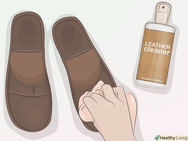 Використовуйте безпечне для очищення шкіри мило. обробляти зовнішню поверхню шкіри можна тільки засобами, спеціально призначеними для шкіряного взуття. До таких засобів відноситься безферментне рідке мило для виробів зі шкіри. [25] також для видалення забруднень з тапочок ви можете використовувати звичайний миючий засіб для шкіряного взуття, яким ви чистите черевики. [26]- Якщо підкладка тапочок також виконана зі шкіри, чистіть її тим же чином, що і зовнішню сторону тапочок.