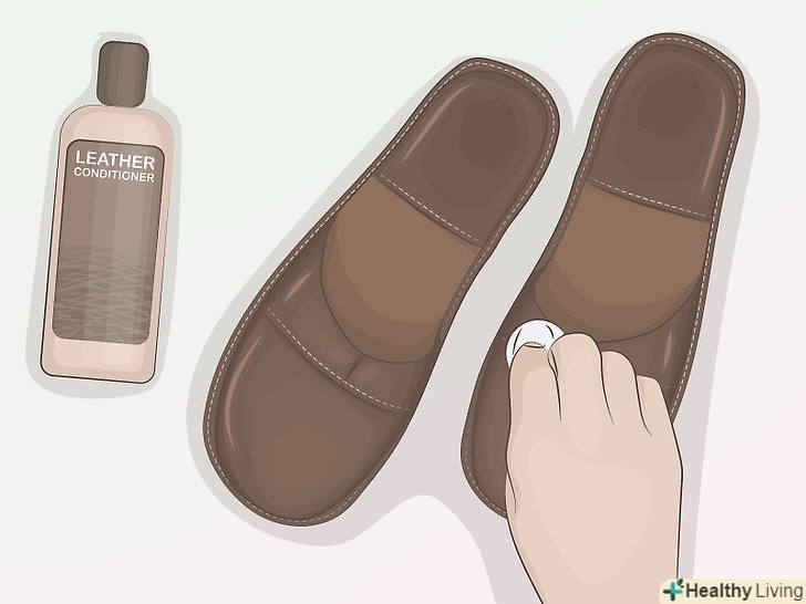 Скористайтеся кондиціонером для виробів зі шкіри. щоб шкіряні тапочки залишалися м'якими і не пересихали, після чищення обробіть їх кондиціонером для шкіряного взуття. [28] шкіра буде краще вбирати в себе натуральні засоби, ніж синтетичні. Застосовуйте Кондиціонер відповідно до рекомендацій на його упаковці, щоб продовжити термін служби своїх тапочок. [29]