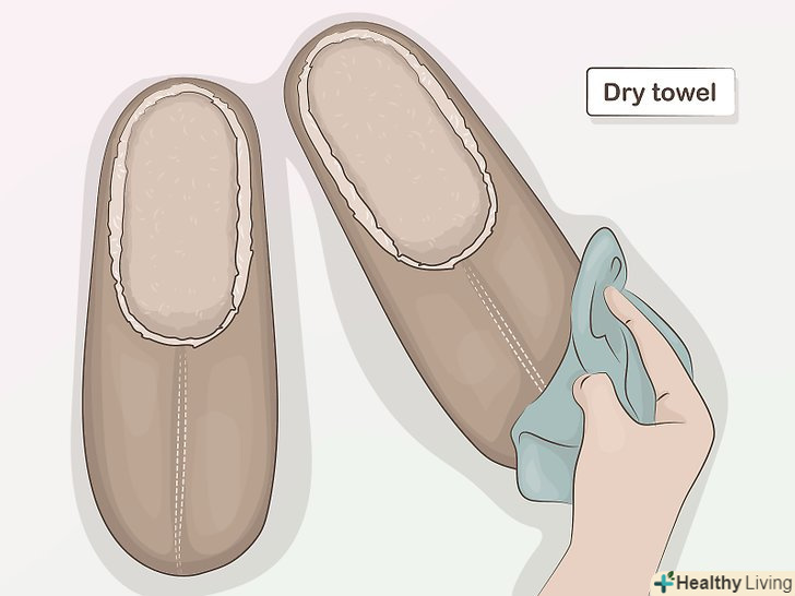 Протріть тапочки рушником. замшеві тапочки не можна прати в пральній машині або вручну за допомогою замочування. Якщо ви щось пролили на замшу, візьміть чистий рушник і промокніть вологу з тапочок. [12]- Якщо замша оброблена водовідштовхувальним покриттям, ви можете протерти її вологим рушником. В іншому випадку використовуйте сухий рушник. [13]