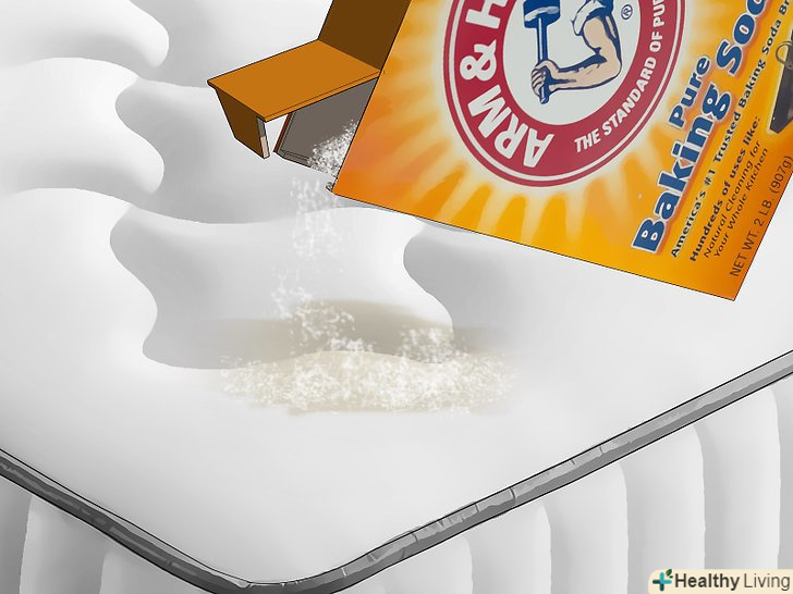 Посипте забруднене місце харчовою содою. після того як ви промокнете матрац і видаліть просочилася рідина, посипте забруднену ділянку харчовою содою. Харчова сода вбере залишки рідини і допоможе позбутися від неприємного запаху. [4]- Якщо у вас немає під рукою харчової соди, замість неї можна використовувати крохмаль. Однак врахуйте, що, на відміну від харчової соди, крохмаль не усуває запахи.