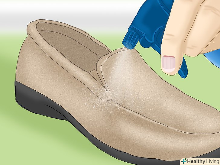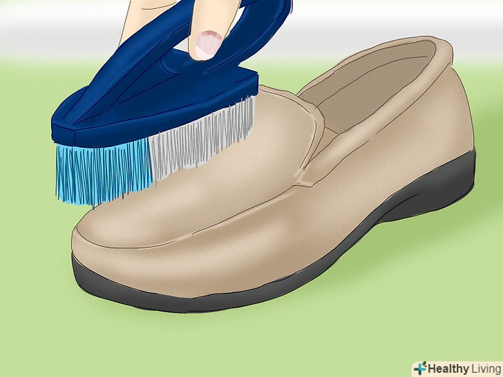 Нанесіть на взуття очищувач. використовуйте спирт або розчин води та миючого засобу. Візьміть зубну щітку або щітку з м'якими щетинками і очищайте по невеликій ділянці взуття за раз.