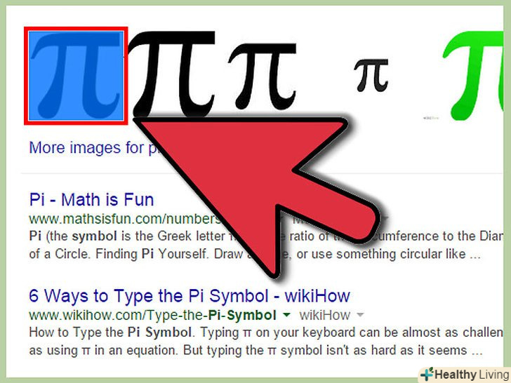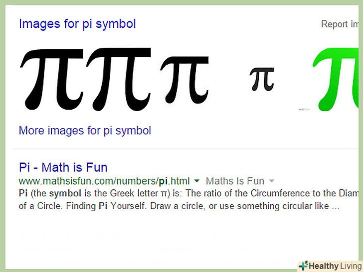 Знайдіть символ π в Інтернеті.просто введіть в пошуковий сервіс запит "Пі" і ви відразу його знайдете. Ви зможете скопіювати символ з веб-сторінки.