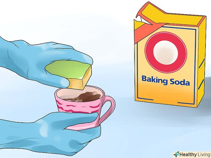 Нанесіть м'який миючий засіб на плями від кави або чаю. якщо на порцеляні залишилися плями від кави або чаю, використовуйте м'який миючий засіб, щоб очистити їх. Плями також можна обережно видалити харчовою содою і водою. [12] [13]- Яблучним оцтом, розведеним у воді, видаліть з порцеляни водні розводи, які зазвичай виникають під час миття сервізу в посудомийній машині і коли вода занадто довго залишається на порцеляні.