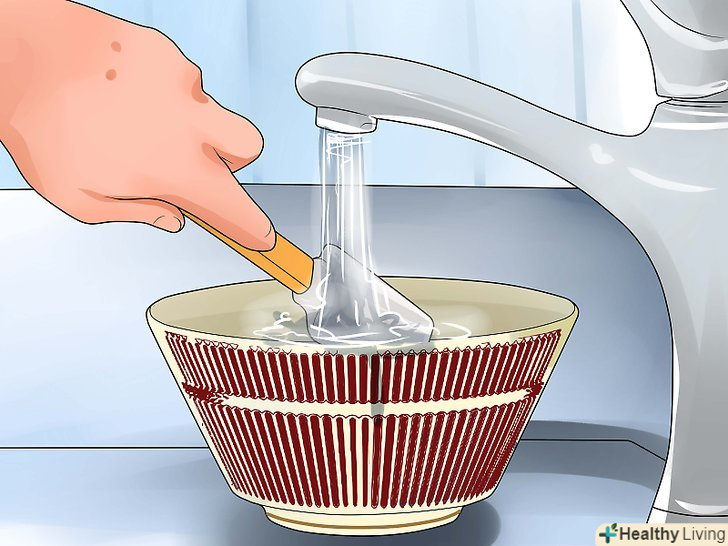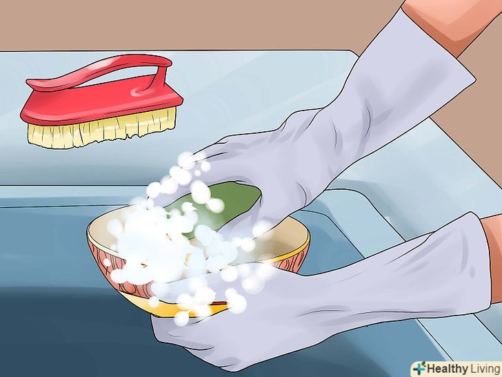 Теплою водою і гумовою лопаткою видаліть з порцеляни частинки їжі. Не залишайте залишки їжі на порцеляні протягом тривалого періоду часу, так як кислота в них здатна роз'їсти глазур на порцеляні. Якщо у вас немає часу помити фарфор відразу, обполосніть його в теплій воді або змийте частинки їжі при першій же можливості.- Не скребіть залишки їжі з порцеляни столовими приборами, так як вони можуть подряпати фарфор або пошкодити його. Замість цього акуратно видаліть частинки їжі теплою водою і гумовою лопаткою. [6]