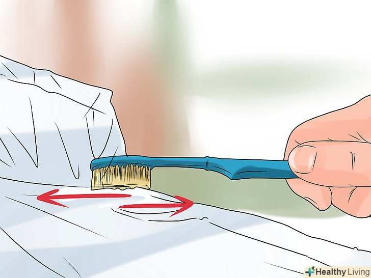Ретельно втирайте пасту в одяг за допомогою зубної щітки або щіточки для нігтів. можна нанести додаткову кількість пасти в міру її поглинання тканиною. Пляма почне зникати прямо у вас на очах. [4]- Харчова сода добре виводить плями сама по собі, але також можна спробувати налити на пляму оцет. Оцет негайно почне пузиритися, тому дійте обережно.
