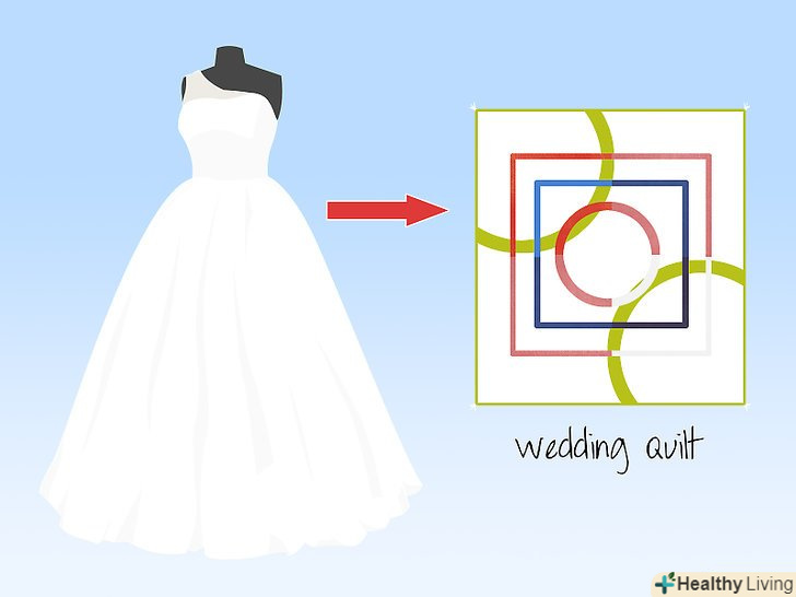 Зробіть з весільної сукні пам'ятні предмети. вони будуть нагадувати вам про ваш день весілля.- Зробіть з весільного плаття клаптикову ковдру, яку ви можете подарувати вашій дитині або іншому члену вашої родини на їх весілля.