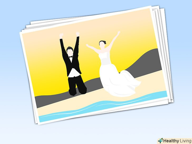 Зробіть фото вас і вашого чоловіка в стилі "зіпсуй плаття". зараз модно надягати свою сукню після весілля на фотосесію, в процесі якої плаття вимазується або навіть псується.- Подумайте про фотографії, на яких ви з чоловіком йдете через брудне поле або стрибаєте в ставок. Або ж зробіть знімок того, як ви з чоловіком робите щось унікальне в ваших відносинах. Наприклад, якщо ви захоплюєтеся мистецтвом, ви можете використовувати своє весільне плаття в якості полотна на фотографіях. Або можливо ви любите бігати марафон разом, так що на фотознімку зафіксуйте, як ви двоє біжите у весільних нарядах. Це можливість зробити кілька креативних фотографій, не переживаючи про сукню.