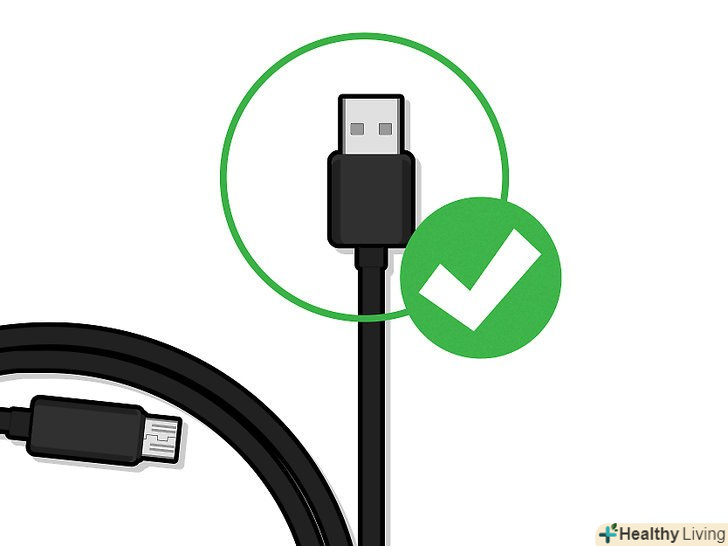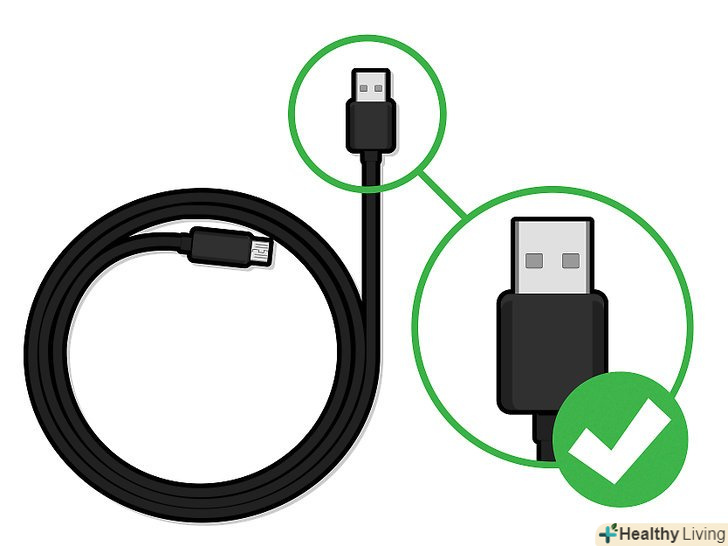 Знайдіть USB-штекер зарядного кабелю.цей прямокутний штекер знаходиться на одному кінці кабелю, причому він більше штекера на іншому кінці кабелю.- На іншому кінці кабелю знаходиться невеликий овальний штекер microUSB (мікроusb).