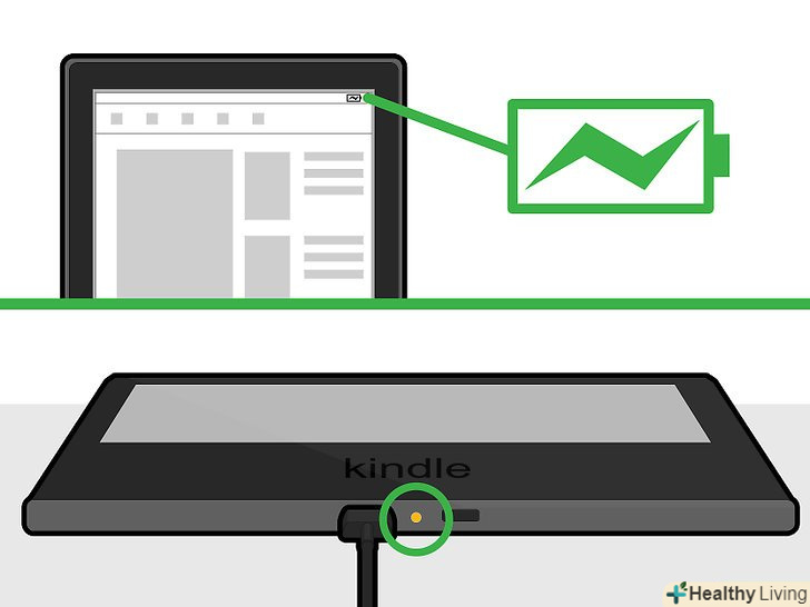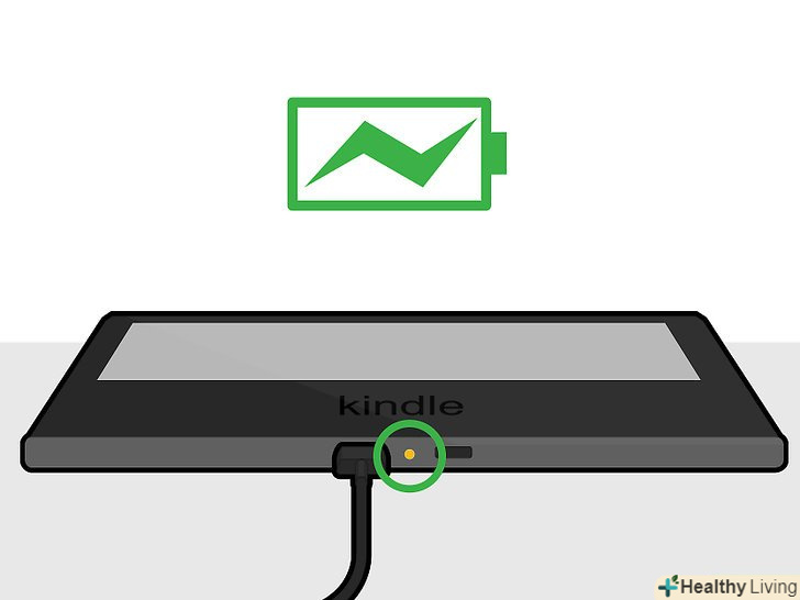 Зачекайте, поки загориться індикатор зарядки.як тільки Kindle почне заряджатися, в нижній частині пристрою загориться жовтий індикатор, а в значку рівня заряду батареї, який знаходиться в правому верхньому куті екрану Kindle, з'явиться значок у вигляді блискавки.- Індикатор загориться зеленим, коли Kindle повністю зарядиться.