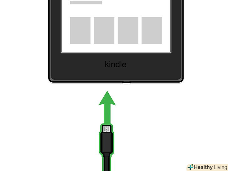 Вставте microUSB-штекер (він знаходиться на іншому кінці зарядного кабелю) в зарядний порт Kindle.цей штекер підключається до овального порту в нижній частині Kindle в будь-якому напрямку.