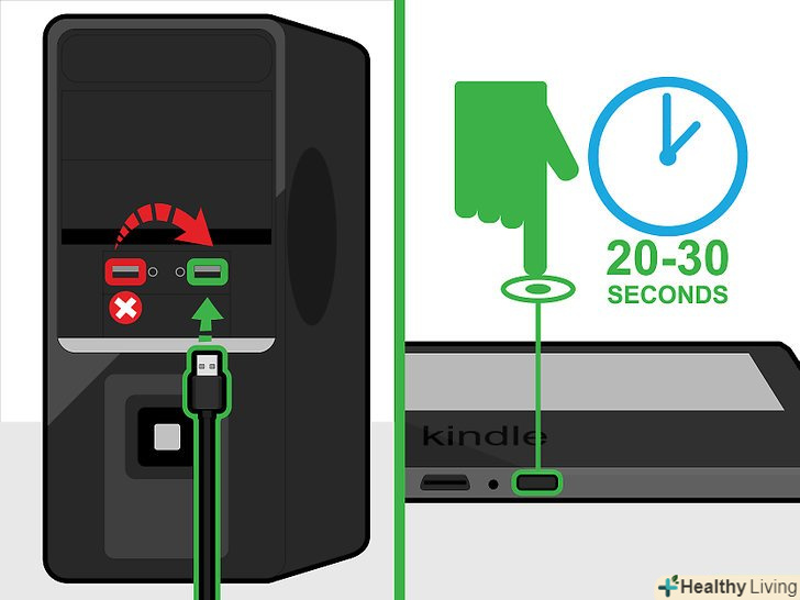 Усуньте неполадки при зарядці.якщо індикатор заряджання не загорівся, Kindle не заряджається. В цьому випадку:- Підключіть зарядний кабель Kindle до іншого USB-порту комп'ютера-можливо, поточний USB-порт взагалі не здатний заряджати пристрої.