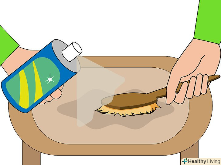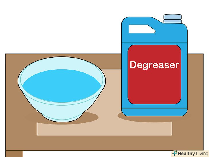 Нанесіть знежирюючий засіб. розбавте невелику кількість знежирюючого засобу великою кількістю води і використовуйте розбризкувач або пульверизатор, щоб рівномірно обробити деревину. Після цього протріть поверхню нейлоновою щіткою. Потім змийте продукт чистою водою. [11]- Знежирюючий розчин також можна розпорошити за допомогою старої ємності з-під засобу для миття вікон або іншого аерозольного флакона. Після використання ретельно промийте ємність водою з милом.