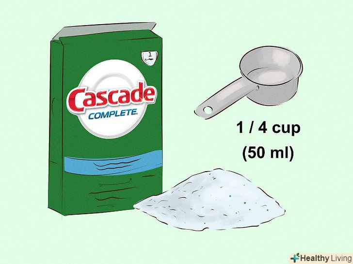 Додайте у воду миючий засіб. використовуйте близько 50 мл слабо пінистого сурфактанту, типу порошкоподібного миючого засобу для посудомийної машини. Можна вибрати Cascade Complete - він заснований на ферментативної активності, а не кислотної. Кислотні миючі засоби, в результаті, зітруть герметик з покриття і воно потьмяніє. В крайньому випадку, можна скористатися будь-яким засобом для миття посуду.