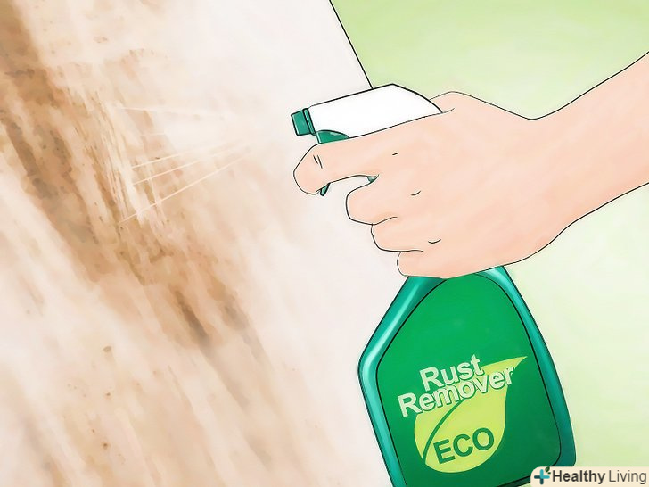 Нанесіть екологічно чистий засіб для видалення іржі. якщо ви не хочете використовувати агресивні хімікати на забарвленій ділянці, візьміть екологічно чистий засіб для видалення іржі. Вони виготовляються з натуральних інгредієнтів і легко можуть бути змиті водою. Ви можете придбати екологічно чистий засіб для видалення іржі в місцевому господарському магазині. [7]