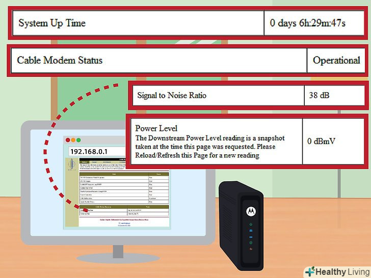 Почитайте звіт про стан.після завантаження сторінки ви побачите звіт про стан вашого модему. Тут ви можете упевнитися, що все працює як треба. Наведені цифри є лише прикладом поточного стану.- Uptime: як довго ваш модем був включений.