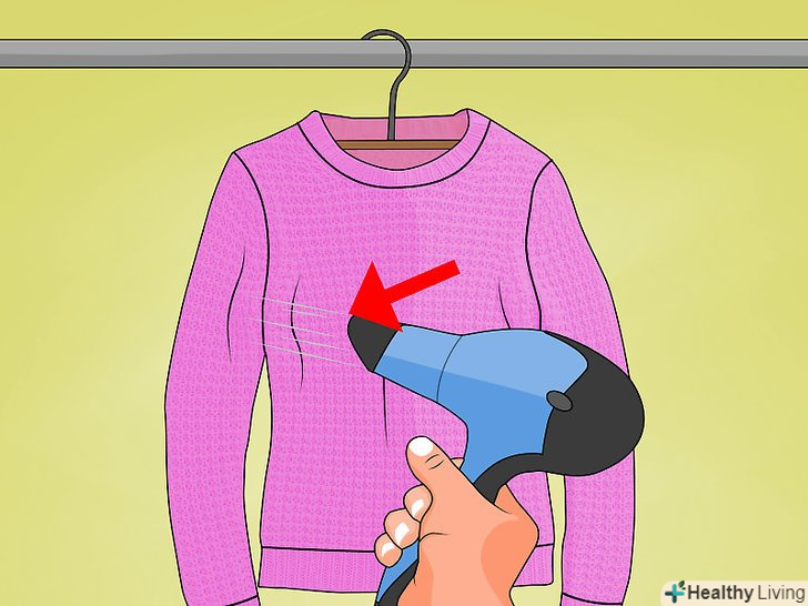 Висушіть светр феном для волосся. надавши окремим ділянкам светри правильну форму, візьміть фен для волосся і висушіть светр. Потік гарячого повітря в поєднанні з гарячою водою посприяють закріпленню потрібної форми і усадки деталі до вихідного розміру. [10]- Так як в даному методі потрібно використовувати гарячий потік повітря, не включайте фен на холодний обдув. Почніть з невеликого нагрівання. Якщо светр буде сохнути недостатньо швидко, переключіть фен на більш гарячий потік повітря.