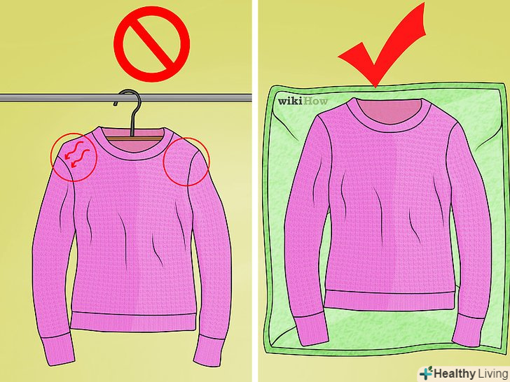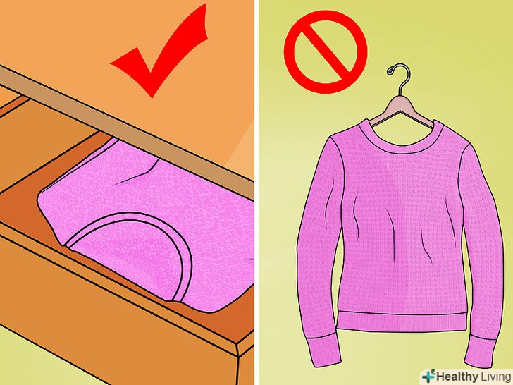 Складайте светр в шафу, а не вішайте. Светри необхідно складати і зберігати на полиці або в ящику, а не вішати на вішалку. У висять светрів можуть розтягуватися окремі ділянки. Крім того через вішалки на плечах светри можуть з'явитися витягнуті горби. Якщо можливо, завжди складайте светр, а не вішайте. [11]