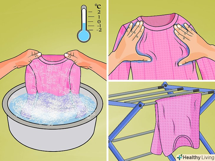 Періть светр вручну. по можливості, светр завжди необхідно прати вручну. Періть його в холодній воді з додаванням невеликої кількості миючого засобу і кондиціонера для тканини. Ретельно споліскуйте річ після прання, щоб на ній не залишалося слідів піни. Щоб видалити надлишок вологи, злегка здавлюйте светр. Не вичавлюйте і не викручуйте його. Щоб висушити светр, складіть його навпіл і перекиньте через товсту поперечину підставки для сушіння білизни. [14]