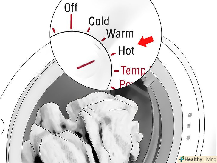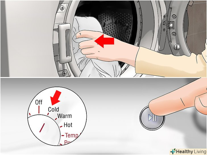 Виперіть білизну звичайним чином, налаштувавши пральну машину на цикл холодного прання. додайте в пральну машину звичайну порцію миючого засобу і відбілювача, потім завантажте її білизною і запустіть повний цикл прання в холодній воді. Цей цикл не дозволить закріпитися на тканині білкам з органічних речовин, збільшуючи шанси на те, що плями відіпираються. [7]