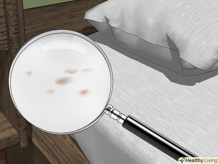 Розшукайте гнізда клопів. Якщо не знищити гнізда клопів, укуси комах і плями на постільній білизні так і будуть дошкуляти вас. Пошукайте комах і їх кладки всередині і навколо ліжка, в ящиках приліжкових тумбочок, в шафах, за і під меблями, а також в шторах.- Ліхтарик допоможе вам краще розглянути комах і їх яйця. Постільні клопи-досить дрібні комахи коричневого кольору. Їх кладки часто являють собою скупчення яєць.