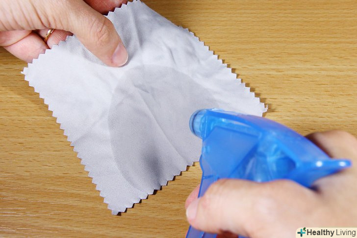 Розпиліть спиртовий засіб для очищення екранів на чисту серветку. якщо після очищення екрану сухою серветкою залишилися брудні плями, то спробуйте змочити серветку. Розпиліть чистячий розчин 2-3 рази на м'яку тканину. Не наносьте розчин прямо на екран, щоб рідина не пошкодила телевізор. [4] Не використовуйте сильнодіючі хімічні засоби на зразок нашатирного спирту і бензолу, оскільки вони можуть затемнити екран і зробити зображення тьмяним.- Чистячі засоби на основі ізопропілового спирту продаються в багатьох магазинах побутової техніки та комп'ютерних приладдя. Вибирайте розчин для телевізорів або моніторів.