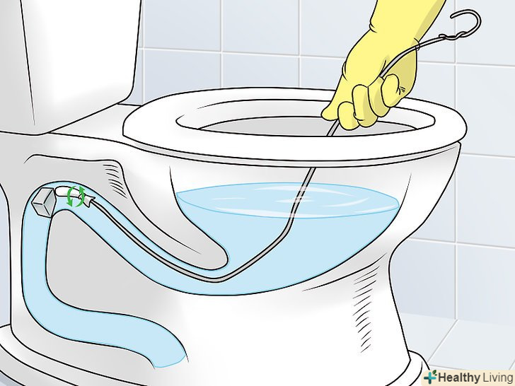 Вставте обмотаний кінець дроту в слив. проверніть і проштовхніть дріт вперед, а потім використовуйте обертальні рухи, щоб прочистити слив. Якщо край дроту уперся в засмічення, то спробуйте проштовхнути його. Продовжуйте до тих пір, поки вода не почне вільно йти з унітазу.- Не забудьте надіти гумові рукавички, щоб не забризкати руки під час роботи.