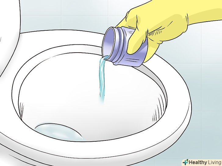 Налийте вказану кількість рідини в унітаз. дотримуйтесь інструкцій виробника. Також не забудьте опустити кришку унітазу, щоб отруйні випаровування не проникали в приміщення. [10]- Ніколи не використовуйте вантуз відразу після додавання розчину, інакше небезпечні бризки можуть потрапити на шкіру.