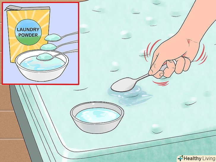 Використовуйте суху піну, щоб видалити в'їдається пляма. змішайте в маленькій мисці 3 столові ложки (50 грам) сухого прального порошку і 1 столову ложку (15 мл) води. Ложкою розподіліть пасту по всьому плямі на матраці. [12]- Можливо, вам знадобиться зробити більше сухої піни, якщо пляма велика.