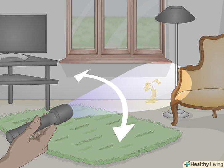 Відправляйтеся до того місця, де, за вашими підозрами, може перебувати сеча, і включіть ультрафіолетову лампу. зазвичай пляма котячої сечі розташовується приблизно там, звідки йде неприємний запах, але іноді, щоб встановити джерело запах, потрібно трохи озирнутися. Щоб пошуки плями стали більш ефективними, приступайте до них в тому місці, де кішка імовірно могла сходити в туалет, а потім рухайтеся далі в сторони. [3]
