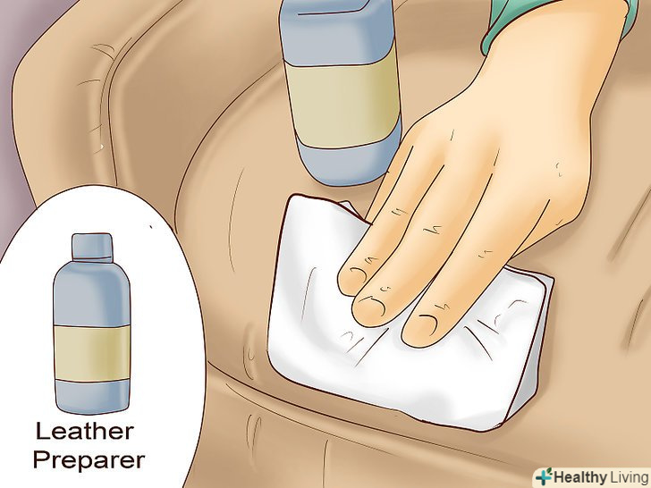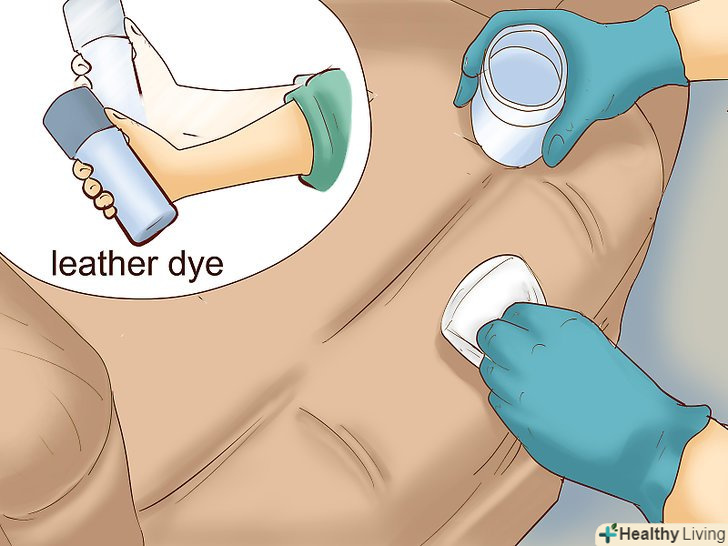 Підготуйте шкіру для фарбування. використовуйте засіб, який можна придбати у продавців барвників для шкіряних меблів. Нанесіть засіб на губку або паперовий рушник і м'яко протріть шкіру, масажними рухами втираючи розчин в поверхню, але не розпилюйте прямо поверх шкіри, щоб не просочити матеріал наскрізь. Такий засіб видалить верхній захисний шар силікону. Надмірна кількість розчину може пошкодити шкіру.- Можна використовувати інші продукти на зразок ацетону, але вони вкрай агресивні і можуть легко пошкодити шкіру або залишити хімічний опік!