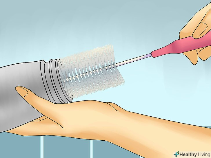 Використовуйте щітку для миття пляшок. Якщо у пляшки занадто вузьке горлечко, і вам не вдається дістати до дна губкою, використовуйте щітку для миття пляшок. У щітки для миття пляшок є довга ручка, за допомогою якої можна почистити найглибші частини пляшки. Вона особливо корисна, якщо ви наповнювали пляшку чимось, крім води. [3]- Деякі пляшки з нержавіючої сталі продаються разом з такою щіткою. Якщо ваша пляшка продавалася без щітки, замовте її по Інтернету або купіть в місцевому господарському магазині.