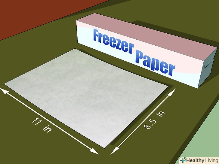 Відріжте шматок паперу для заморозки (freezer paper) того ж розміру що і ваша тканина – 210 мм х 297 мм. ви, по суті, будете поєднувати папір і тканину разом, тому вони повинні мати точно однаковий розмір.- При покупці паперу для заморозки переконайтеся, що на упаковці вказано "freezer".Не переплутайте її з вощеним папером, що часто трапляється.