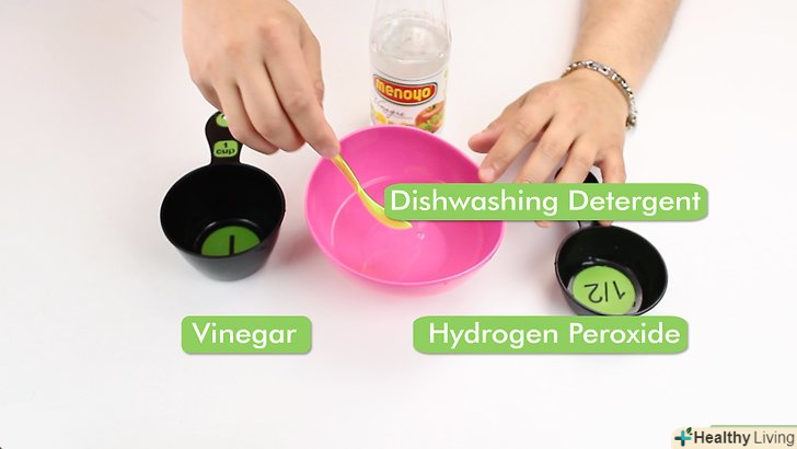 Приготуйте Чистячий засіб. вам буде потрібно оцет, засіб для миття посуду, перекис (3%). Вам потрібно буде зробити і використовувати два засоби. [12]- Щоб приготувати перший розчин, змішайте оцет і воду. Візьміть одну частину оцту і дві частини води. Якщо пляма маленька, візьміть третину склянки оцту і дві третини склянки води.