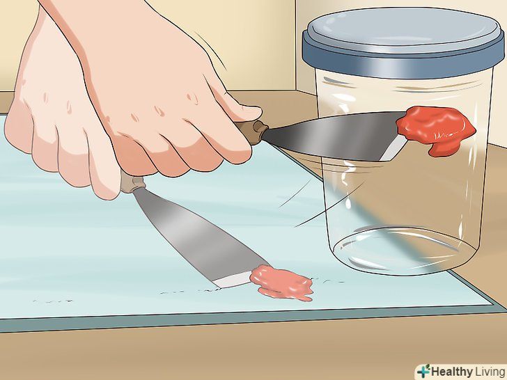 Зберіть фарбу шпателем. Шпатель-це невеликий, плоский будівельний інструмент з металу або пластику. Якщо пляма ще не засохло, то шпателем можна зібрати значну частину фарби. Бажано не шкребти фарбу, інакше вона лише глибше проникне в килим. Зберіть фарбу на поверхні, не вдавлюючи шпатель занадто сильно. [7]- Збирайте фарбу в спеціальну ємність.