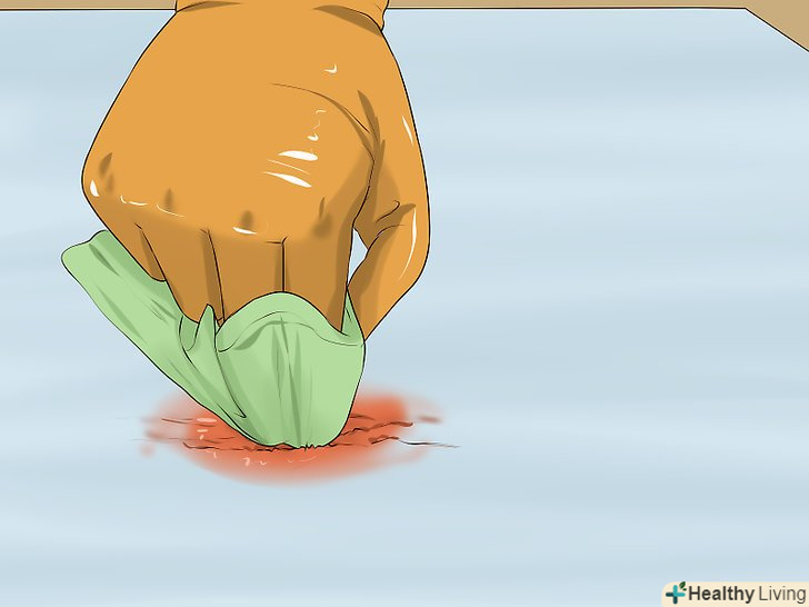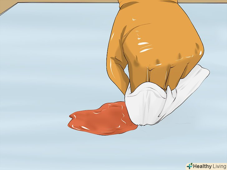 Промокніть пляму серветкою з миючим засобом. перш за все потрібно намочити пляму вологою серветкою. Використовуйте тканину, яку не шкода викинути, інакше після прибирання серветку доведеться ретельно прати. Додайте на серветку приблизно столову ложку (15 мілілітрів) миючого засобу і промокніть забруднену ділянку. Не втирайте фарбу в килим, але злегка промокніть пляму.- Така дія не видалить забруднення повністю, але допоможе відокремити фарбу від волокон килима і полегшить подальшу роботу. [1]