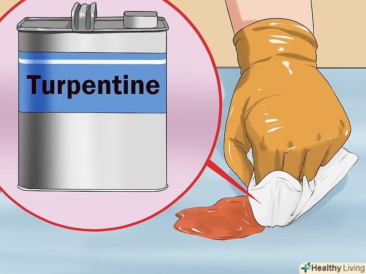 Додайте на серветку скипидар і продовжуйте промокати. Скипидар допоможе відокремити фарбу від волокон. Така дія дозволить видалити практично всю фарбу без необхідності терти килим. [9]