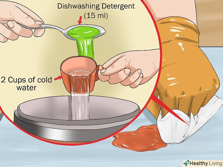 Очистіть забруднення розчином з засобу для миття посуду і холодної води. зібравши фарбу, потрібно очистити волокна килима, які змінили забарвлення. На дві склянки (500 мілілітрів) холодної води додайте столову ложку (15 мілілітрів) засобу для миття посуду. Змочіть в розчині білу серветку і обробіть забруднення. Втирайте розчин до тих пір, поки ділянка не стане чистим.- Після прибирання зберіть залишки розчину паперовим рушником. [10]