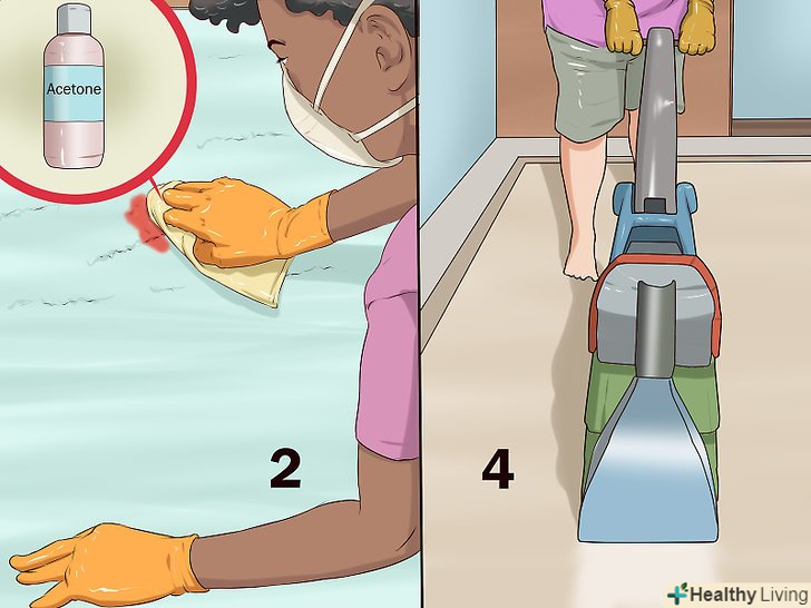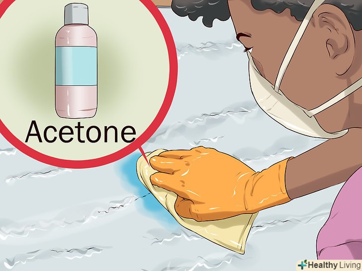 Додайте на ганчірку ацетон і обробіть пляму. на відміну від миючих засобів, ацетон набагато ефективніше руйнує фарбу і виводить подібні забруднення. Не додавайте занадто багато ацетону на ганчірку. Досить просто змочити тканину. [2]- Забезпечте приплив свіжого повітря в приміщення. Тривала дія випарів ацетону шкідливо для здоров'я.