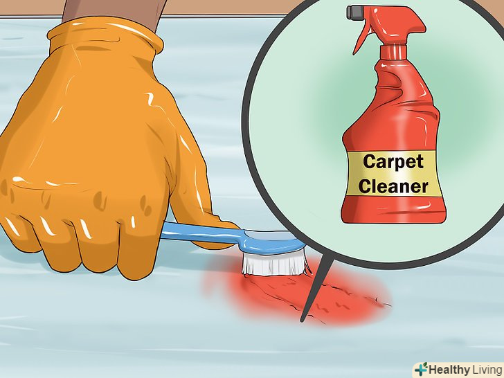 Обробіть пляму засобом для чищення килимів. якщо ацетон добре відокремлює фарбу від килима, то засіб для чищення килимів дозволить видалити забруднення. Можна використовувати зубну щітку, щоб м'яко обробити пляму і не пошкодити килим. Нанесіть засіб прямо на килим, а потім обробіть ділянку старою зубною щіткою. [3]- Після обробки залиште засіб на п'ять-шість хвилин.