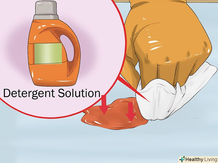 Обробіть пляму засобом для миття посуду. змішайте столову ложку (15 мілілітрів) речовини і склянку (250 мілілітрів) теплої води. Нанесіть розчин на білу ганчірку. Кольорові серветки можуть забруднити килим. Рухайтеся від зовнішніх кордонів до центру, щоб обробити пляму. [6]- Наносите розчин м'якими рухами, щоб фарба не в'їлася в килим ще глибше.