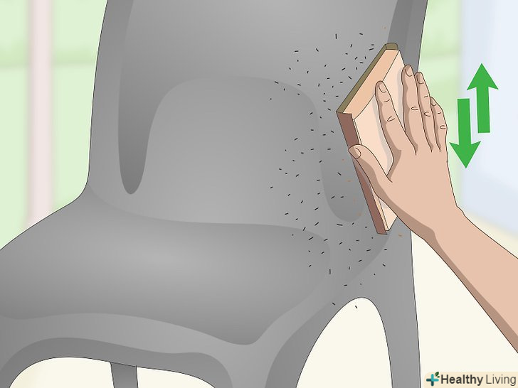 Відшліфуйте поверхню пластику наждачним папером із зернистістю 6-H (P220). завдяки шліфовці фарба краще пристане до поверхні. Натискайте із зусиллям і проведіть наждачним папером по поверхні пластика. Коли закінчите шліфувати, витріть пил сухою щіткою. [11]- Якщо у вас немає сухої щітки, візьміть замість неї малярську кисть.