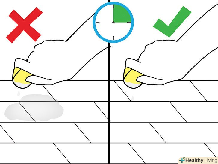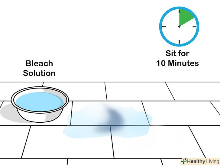 Нанесіть розчин на пляму. вилийте частину відбілюючого розчину прямо на чорнильну пляму. Нанесіть відбілювач м'якою тканиною, якщо боїтеся налити занадто багато відбілювача на підлогу. Зачекайте 10 хвилин. Все має відбутися дуже швидко. Якщо це не допомогло, спробуйте ще раз. Якщо пляма все одно залишилося, залиште відбілювач на ніч. [11]- Відбілювач також можна нанести на зубну щітку з м'якою щетиною. Головне, переконайтеся, що ви більше ніколи не будете використовувати цю зубну щітку!