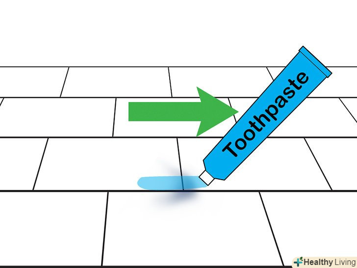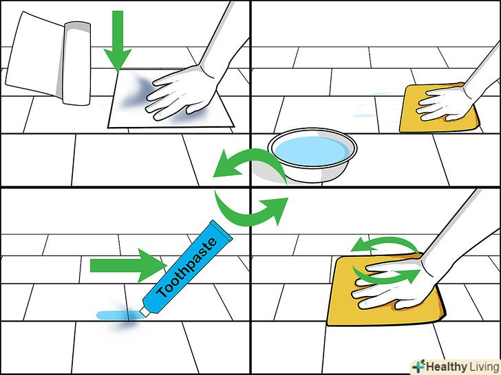 Нанесіть зубну пасту на пляму. для цього підійде звичайнісінька зубна паста, але не гелева. Звичайну зубну пасту можна купити в будь-якій аптеці. Видавіть її прямо на чорнильну пляму. [2]- Купуйте зубну пасту з відбілюючим ефектом або з содою. Це допоможе очистити пляму.