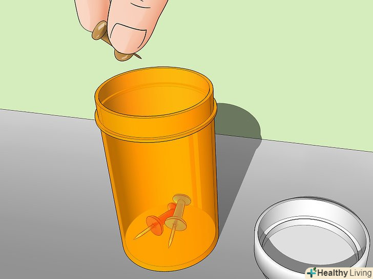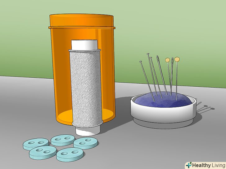 Зробіть портативний набір для шиття. у порожній баночці з-під ліків можна тримати невеликий Дорожній Набір для шиття. Покладіть в баночку дві голки, котушку білих, темно-синіх або інших часто використовуваних ниток і кілька гудзиків. До внутрішньої сторони кришки приклейте невелику подушечку для голок. [9]