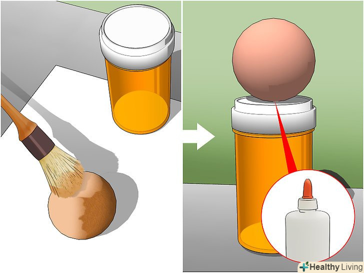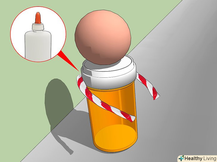 Зробіть голову співочого. зніміть з баночки з-під ліків кришку. Знайдіть невеликий дерев'яний кульку, діаметр якого відповідає шийку баночки. Пофарбуйте кульку фарбою тілесного кольору і приклейте його до шийки баночки за допомогою клейового пістолета. Це буде голова церковного співочого. [17]- Після того як фарба тілесного кольору висохне, візьміть тонкий пензлик і намалюйте на кульці очі, ніс і рот.