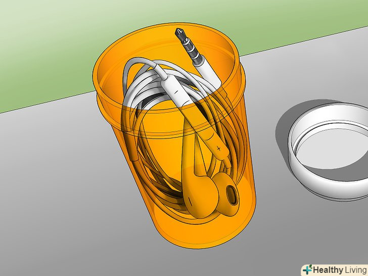Ховайте в порожню баночку з-під таблеток навушники. якщо просто класти навушники в рюкзак, сумку або кишеню, вони можуть заплутатися або зламатися. Замість цього розпряміть навушники, розплутайте всі вузли, акуратно складіть їх в 3-4 рази і помістіть в порожню баночку з-під ліків. Там навушники будуть в цілості, і ви зможете без проблем використовувати їх, як тільки вони знадобляться. [6]