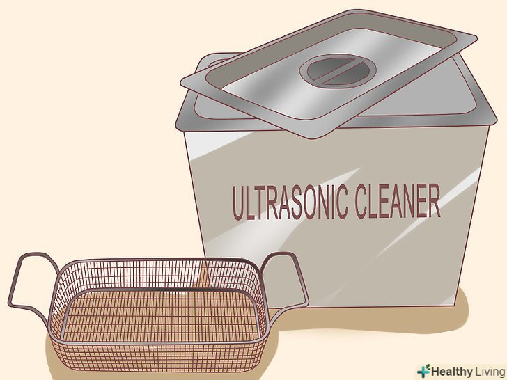 Використовуйте Ультразвуковий очищувач. ультразвукові очищувачі-це спеціальні пристрої, які використовують звукові хвилі для очищення делікатних, складних предметів, таких як ювелірні вироби. Ультразвуковий очищувач може навіть видалити хром в деяких ситуаціях (особливо, коли хромове покриття вже було ослаблено іншим методом). Помістіть хромовані елементи в кошик ультразвукового очищувача і занурте їх в розчин для очищення (часто звичайна вода), потім запустити очищення відповідно до його інструкцій.- Використовуйте замість води розчинник, який може розчинити хром (наприклад, відбілювач), цим можна підвищити потужність ультразвукового очищення. Тільки робіть так, якщо розчинник, який ви використовуєте, не буде роз'їдати деталі ультразвукового очищувача оскільки вони будуть реагувати в будь-якому випадку. Наприклад, луг буде реагувати з алюмінієвими ємностями.