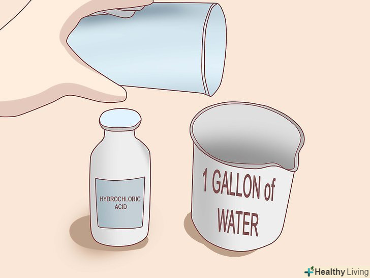 Використовуйте соляну кислоту. соляна кислота є сильною корозійною речовиною. У високих концентраціях може використовуватися для видалення хромування з металевих об'єктів. Для видалення хрому, розчин кислоти повинен бути близько 30-40%. Виконайте дії, зазначені нижче:- Зробіть розчин 1/3 частина соляної кислоти на 1 частину води в посуді для хімічних розчинів (як надміцне пластмасове відро, і т.д.). В якості альтернативи можна купити вже готовий розчин достатньої концентрації.