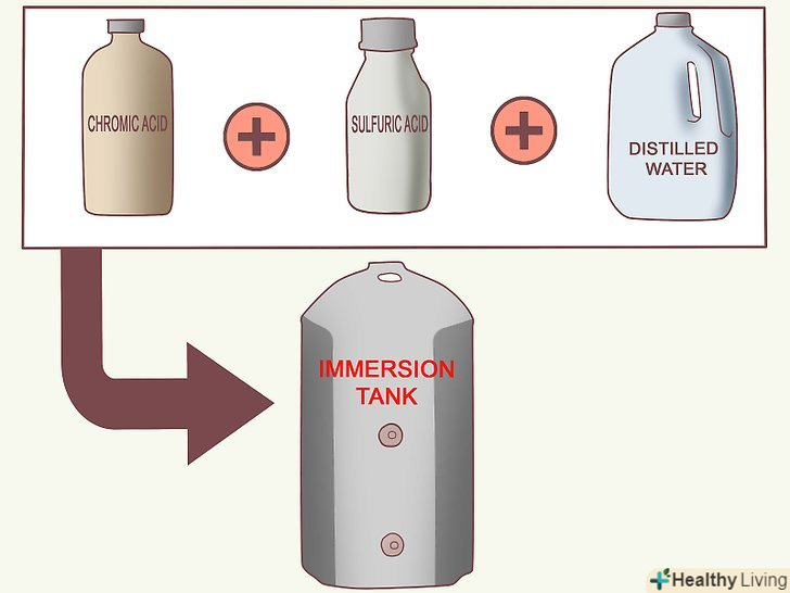 Виконайте зворотний гальванічний процес. Хром наноситься на метал в процесі гальванічного покриття, в якому електричний струм використовується для прив'язки хрому до металу на молекулярному рівні. Якщо звернути назад цей процес-хромування може бути видалено дуже ефективно. Тим не менш, це може бути надзвичайно небезпечно. Мало того, що процес, включає електричний струм, але і в результаті реакції виробляє кілька токсичних, канцерогенних хімічних речовин. Шестивалентний хром, наприклад, є надзвичайно небезпечним продуктом. Таким чином, цей процес краще довірити професіоналам, описані нижче дії наводяться тільки в інформативних цілях.- Змішайте хромову і сірчану кислоту у воді, в співвідношенні приблизно 100:1. Наприклад, ви можете додати 33 Унції (936 грам) кристалів хромової кислоти і 0,33 Унції (9.36 мілілітр) рідини сірчаної кислоти в дистильованій воді, щоб зробити 1 галон (3,79 літра). Змішайте розчин в належній ємності, використовуваної для гальванічного процесу, дослідження матеріалів, і/або хімічної обробки.