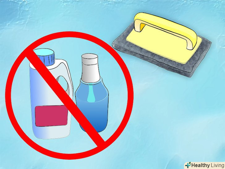 Зітріть хімікати з поверхні абразивною щіткою. щоб відчистити тріщини, використовуйте щітку для плиткових швів. Є два типи щіток: для бетонних і для вінілових басейнів. Перед покупкою переконайтеся, що ви взяли щітку відповідного типу. Щітку можна надіти на довгий жердину і використовувати для видалення плям в місцях, куди вам складно дістатися.